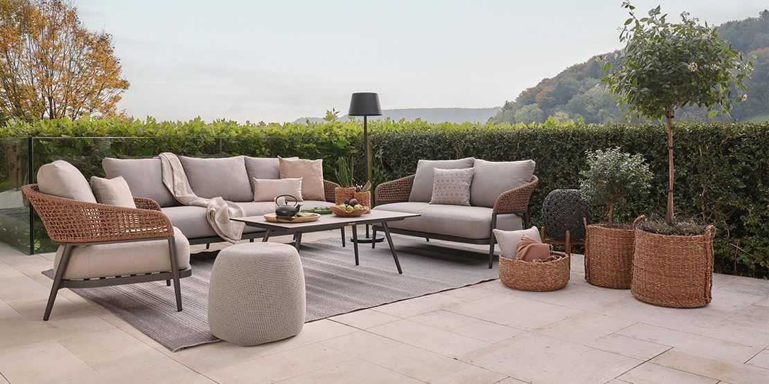 Die neue ENNA Gartenlounge verbindet modernes Design mit einer natürlichen Ausstrahlung. Das Gestell ist aus Aluminium gefertigt kombiniert mit handgeflochtenem Viro Ecolene Geflecht in der Farbe Brown Oak.
