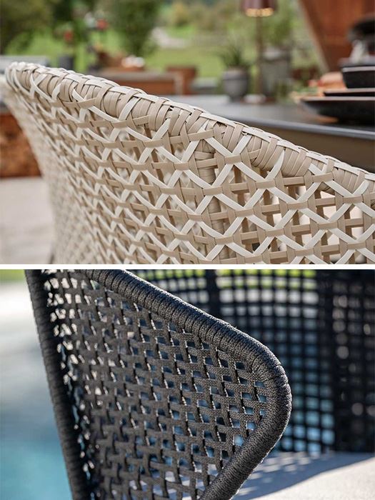 Ropegeflechte bleiben bei Gartenmöbeln weiterhin prägend und entwickeln sich stetig weiter. Das charakteristische Schnurgeflecht-Design verbindet eine moderne, leichte Optik mit hoher Wohnlichkeit und passt damit ideal zum anhaltenden Outdoor-Living-Trend. Schnüre in unterschiedlichen Breiten sowie breite Gurte schaffen spannende Strukturen und verleihen den Möbeln eine zeitgemässe, luftige Ästhetik.