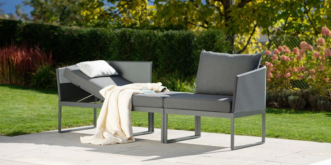 Eine Récamiere kombiniert Sitz- und Liegefunktion. Sie eignet sich besonders für grosszügige Balkone oder Dachterrassen und sorgt für maximalen Komfort im Aussenbereich.